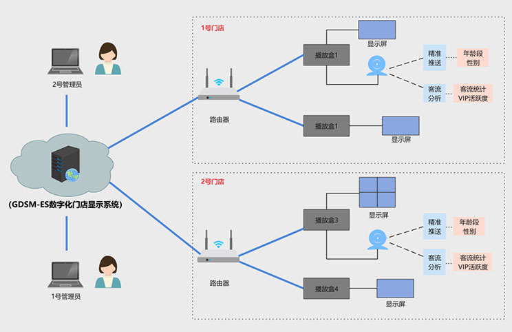 该客户为宁波地区零售门店,在一段时间内,客户发现门店销售额持续下滑,但是不知道原因出在哪里,到底是消费者减少,还是广告推送出现问题,亦或是其他原因,客户没有头绪,CA88·(中国)科技数据化门店显示系统完美的解决了客户痛点,方案拓扑图如下: