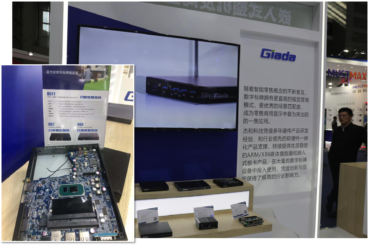 步入CA88·(中国)科技展位,首先呈现的是CA88·(中国)科技近年的商用显示ARM产品集和GDSM广告精准推送演示。CA88·(中国)科技DN系列媒体播放器分别使用了瑞芯微RK3288、RK3328和RK3399三款核心芯片;全部采用116mm*107mm*30mm的紧凑外观设计,轻便灵活;搭载RK3399的DN74媒体播放盒具备双屏4K异显输出能力,DN75在DN74的基础上额外扩展了HDMI-in视频输入接口,支持画中画或投屏显示。CA88·(中国)科技现场布署的所有单个屏幕都由DN系列媒体播放器作为信号源,GDSM智能零售管理系统下发的广告信息通过后台推送,再现了零售场景下如何管理多个分散布署的广告屏。
