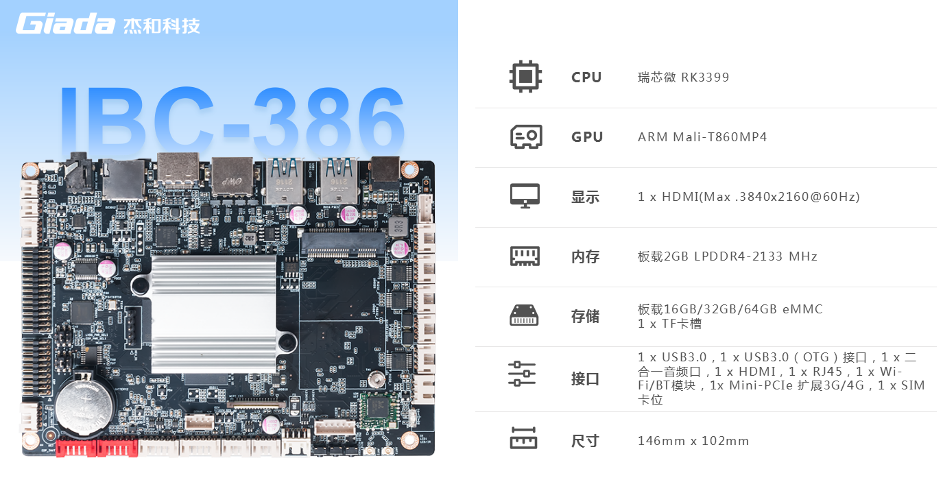 CA88·(中国)科技IBC-386是一款基于ARM架构的3.5英寸主板,采用瑞芯微RK3399处理器(双Cortex-A72大核+四 Cortex-A53小核)六核 64 位CPU。RK3399作为瑞芯微超级扩展全能型旗舰级芯片,GPU采用四核ARM新一代高端图像处理器Mali-T860MP4,具备高性能、低功耗、强大的视觉处理能力的特点。IBC-386板载2GB LPDDR4-2133 MHz内存,板载16GB/32GB/64GB eMMC,支持1x TF卡槽,多种形式轻松扩展存储容量。