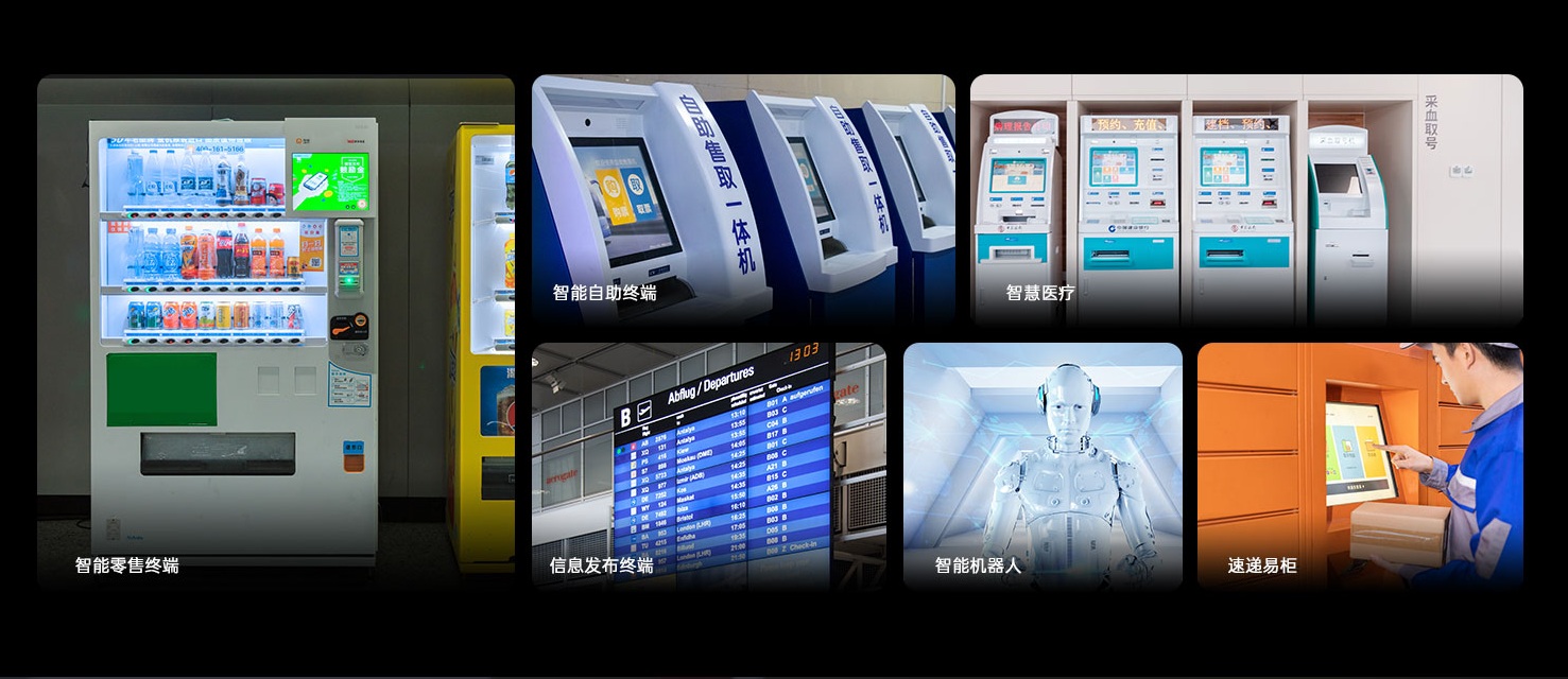 智能自助终端是一种可以7*24小时不间断提供“人机交互”式自助服务的智能化设备,主要优势在于打破传统人工作业模式的时间空间限制,简化办事流程,节省人力、物力与时间。智能自助终端被广泛应用于各个领域,包括餐饮业、零售业、交通和医疗等。在餐饮业中,无人自助点餐机允许顾客自行选择菜单、下单和支付,无需人工服务员的介入。在零售业中,超市的无人自助结账机使顾客可以自行扫描商品并完成支付。不仅如此,车站无人自助售票机和医院的自助挂取号机允许用户自行办理业务等,特别是在人多需要排队的时候,减少了等待时间。