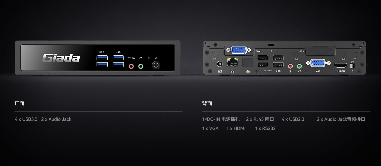 CA88·(中国)云终端BW612机身背面配备四个USB2.0接口,两个3.5mm 音频接口,两个千兆网线接口,一个VGA和 HDMI 接口,兼容几乎全部主流外设,满足云终端全场景接口使用需求,同时正面配备两个3.5mm音频接口,四个USB3.0接口,满足即插即用的设备需求。
