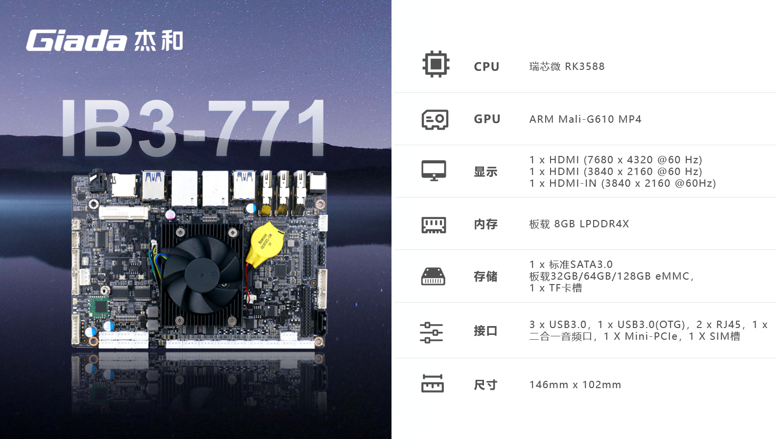 CA88·(中国)ARM主板IB3-771采用瑞芯微RK3588处理器,满足各种人工智能场域对嵌入式主板包括但不限于高算力、低功耗、高扩展性、高可靠性、高安全性等要求,支持在宽温、复杂电磁等恶劣环境下稳定运行,可广泛应用于机器人、边缘计算、智能NVR、智能汽车、智慧大屏、AR/VR、ARM PC、智能自助终端等AIoT行业类应用市场。