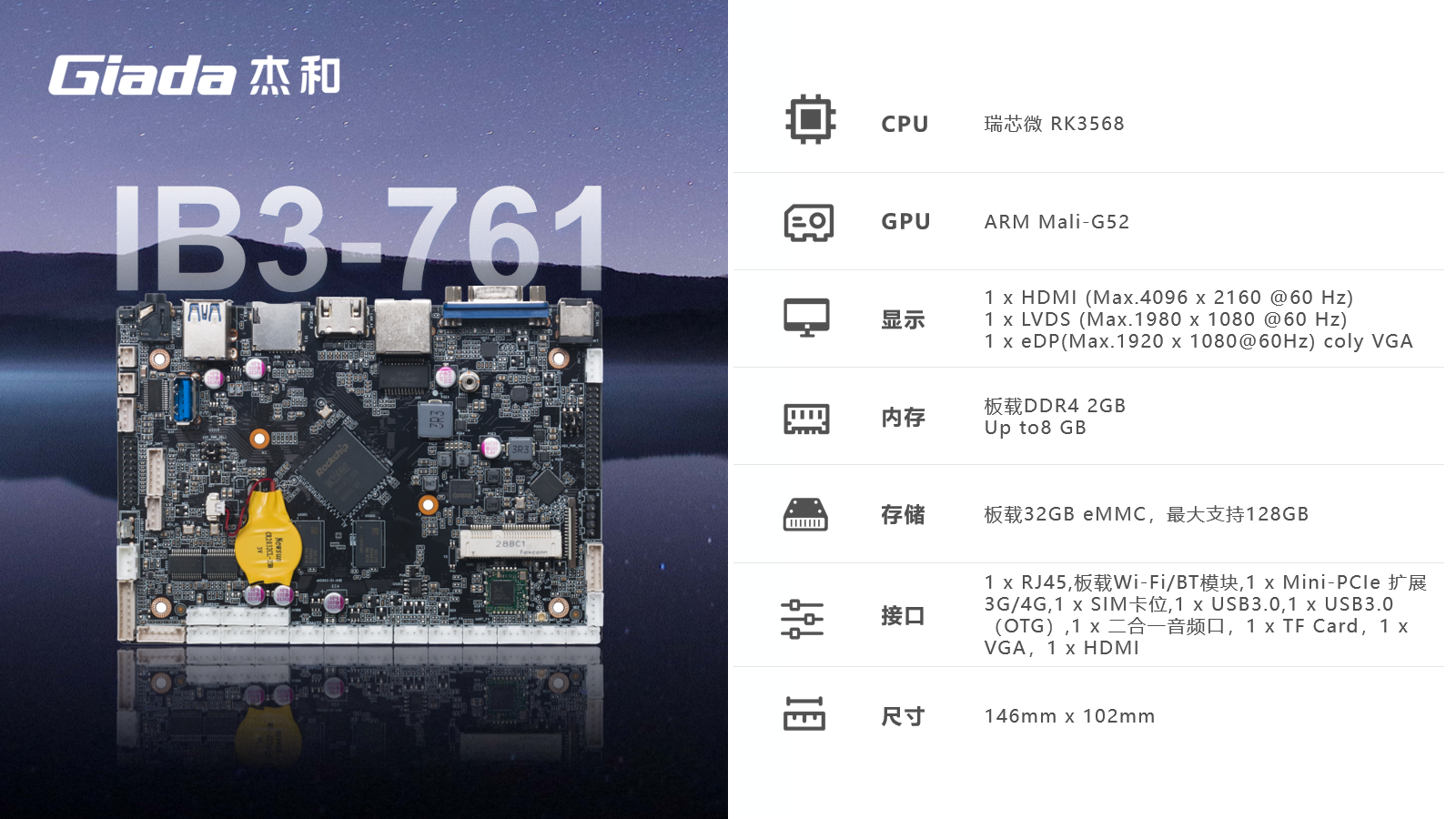 CA88·(中国)ARM主板IB3-761基于瑞芯微RK3568四核64位处理器开发,可实现多任务并行、更大数据集的高效处理,丰富的接口,具有性能强、内存大、集成度高、扩展能力强等特点,在处理速度和图形处理能力方面都表现出色,可广泛应用于物联网网关、边缘存储、工控平板、工业检测、工控盒、自助终端、云终端、车载中控、机器人等行业定制市场。