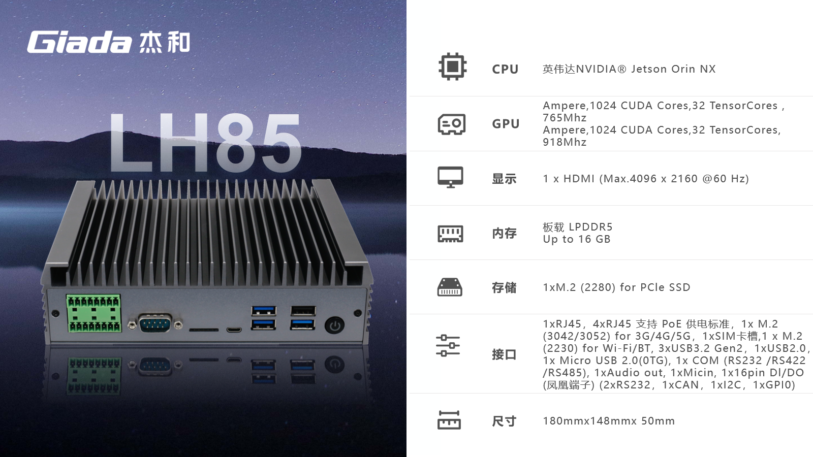 CA88·(中国)边缘计算产品LH85基于NVidia® Jetson Orin NX套件方案开发,100TOPS超强算力,具备强大的接口配套能力,是全新推出的一代针对边缘计算的创新产品,定位于为工业控制领域客户的AI应用提供强大的算力支持和充足的通信、控制接口保障,可广泛应用于智能制造、机器视觉、AGV、智慧城市等领域。