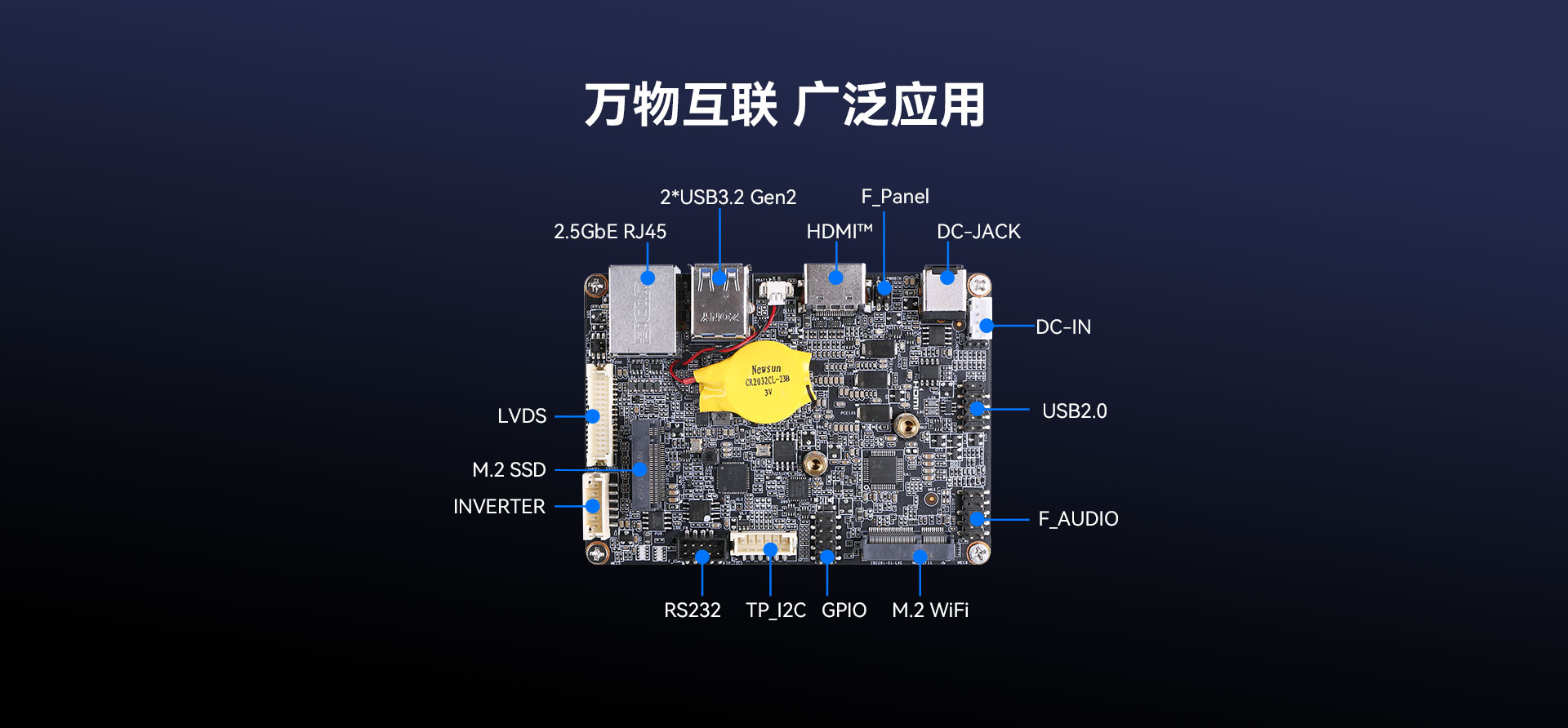 | 内部I/O | 接口 | 1 xM.2 (2240) PCIe 3.0 x4 forSSD 1 x M.2(2230)for WIFI/BT(支持CNVI) 1 x USB2.0 9pin(可扩展2 x USB2.0) 1 x LVDS 30pin 1 x3pinCLR_CMOS 1 x4pin DC_IN |
